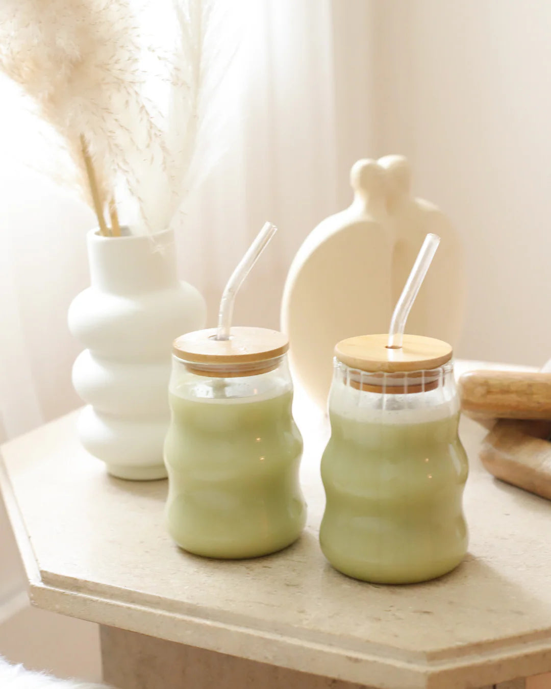 Tumbler en verre minimaliste avec un couvercle en bambou, pour un breuvage à boire chez toi ou sur la route.